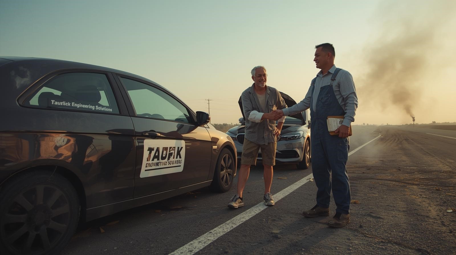 Tiba-tiba ada mobil double cabin gagah berhenti di depan saya. Stiker di pintunya: “Taufik Engineering Solutions”.
