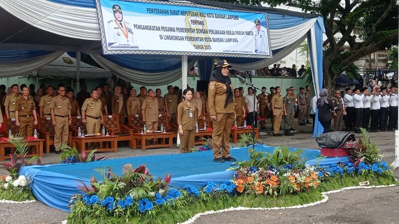 TanjungKarangNews.Com- Wali Kota Bandar Lampung, Eva Dwiana, menyerahkan surat keputusan (SK) pegawai pemerintah dengan perjanjian kerja (PPPK) paruh waktu kepada ribuan tenaga kontrak. Penyerahan tersebut berlangsung dalam apel besar di Lapangan Saburai, Enggal, Selasa, 30 Desember 2025.